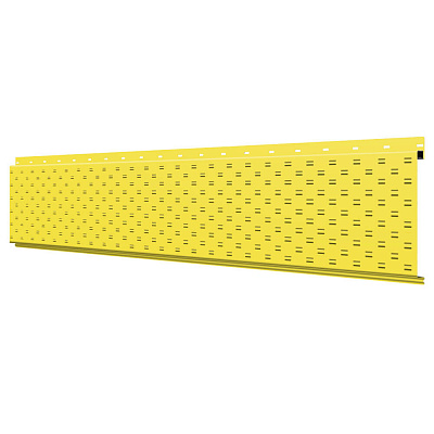 Линеарная потолочно-стеновая панель с ПЕРФОРАЦИЕЙ для вентиляции цвет RAL1018 Желтый применяется в качестве софитов для подшивы крыши, наружной и внутренней отделки потолков, стен, фронтонов фасада дома в Ижевске.