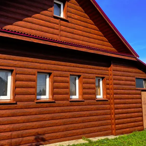 Обновлённый фасад частного дома с металлосайдингом «Бревно Рубленое 4D» в цвете под дерево Тёмный Дуб с уникальным 3D‑покрытием Принтек создаёт впечатление добротного деревянного сруба, сохраняя при этом долговечность, практичность и простоту ухода. Теперь каждый взгляд на дом будет наполнять гордостью и ощущением уюта, а соседи непременно захотят узнать, кто сотворил такую красоту. Это не просто отделка — это обновлённая история вашего дома!